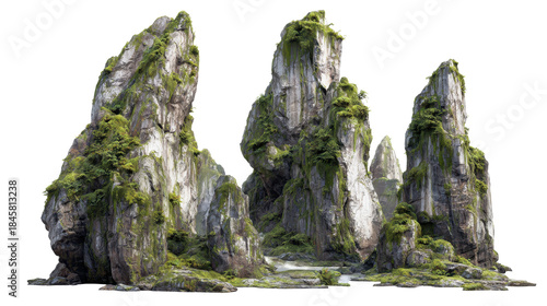 Group of tall weathered mountain rocks covered in lush green moss and foliage, standing on a slight slope, providing a dramatic natural landscape element with a transparent background