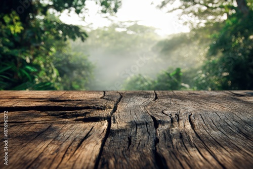 Rustic Wooden Table with Tropical Rainforest Background in Serene Morning Mist