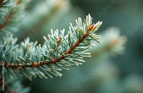 Close up on a branch of a conifer tree showing its green needles and brown stem. The soft blurred background creates a serene natural atmosphere. This image captures fine detail of evergreen foliage.