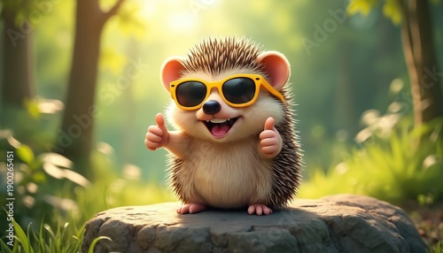 Cute cartoon hedgehog wears yellow sunglasses. Little animal gives two thumbs up gesture. Hedgehog smiles widely in green forest setting. Fun character pose.