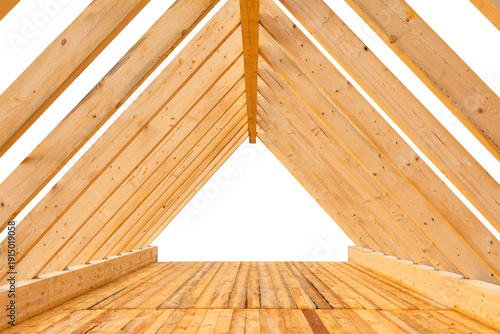 Dachstuhl mit Holzbalken in einem Neubau isoliert als Freisteller über transparentem Hintergrund
