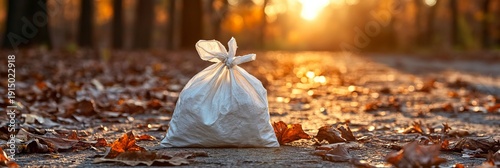 Isolated Fabric Sack Resting on Forest Path Surrounded by Autumn Colors and Sunlit Leaf Litter