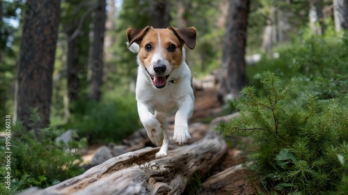 Charming dogs and their owners enjoying exhilarating hiking climbs through lush forests, creating unforgettable outdoor moments. Happy dog leaping over fallen logs, sunlight filtering through the