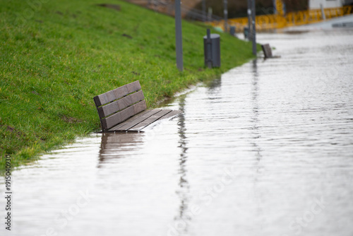 Flood at Moselle river, flooded sidewalk and bench at city of Trier, Germany, climate change, environmet, heavy rainfalls, rising water levels