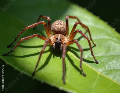 Brown spider with detailed legs rests on green leaf. Macro insect photography shows arachnid in natural habitat. Tiny hairs visible on body and limbs.