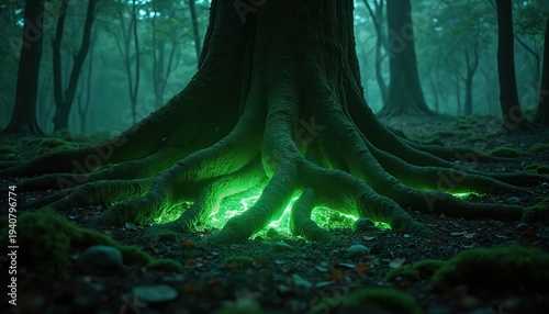 Giant tree roots glow with green mystical energy deep in dark forest ground. Ancient wood spreads across forest floor, mossy earth covered in shadows.