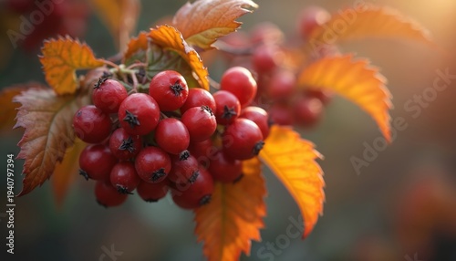Red rowan berries cluster on autumn branch with orange leaves. Closeup detail of natural vibrant flora. Fall season plant growth in wild outdoor environment.