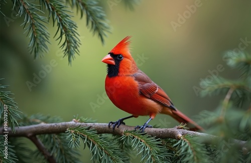 Male northern cardinal perches on a pine tree branch. Bright red bird with black mask and crest looks around. Nature wildlife scene features vibrant cardinal in habitat.