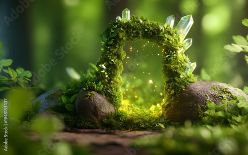 Enchanted Forest Portal Surrounded by Glowing Moss and Bright Crystals