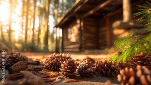 Closeup of Pinecones on Ground in Autumn Near Rustic Wooden Cabin