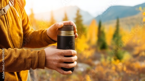 Closeup of Person Filling Thermos in Autumn Wilderness Landscape