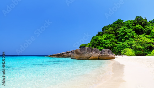 Beautiful tropical beach with white sand, turquoise sea, coastal rocks, and lush green vegetation on the Similan Islands, near Phuket in Thailand.