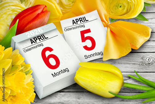 Deutscher Kalender Feiertage Ostern 5. und 6. April 2026 Gelbe Blumen Tulpen Narzissen