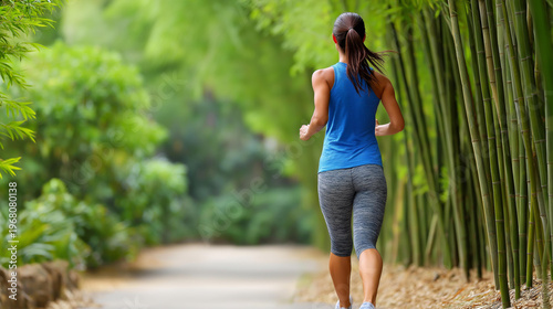 Woman runner jogging along a bamboo path in a forest, fitness and outdoor healthy lifestyle concept, defocused background, with copy space
