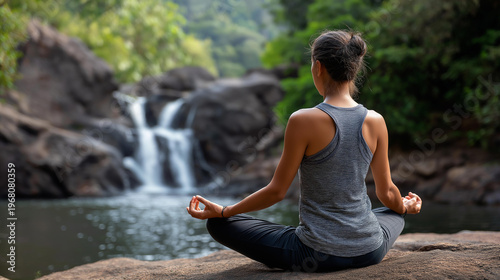 Woman meditating in a lotus yoga pose in front of a waterfall from behind, practicing mindfulness in a tranquil nature setting, wellness lifestyle concept, defocused background,