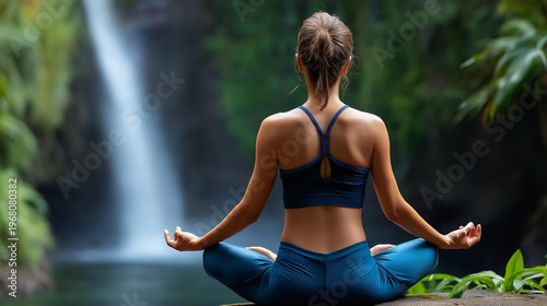 Woman meditating in a lotus yoga pose in front of a waterfall from behind, practicing mindfulness in a tranquil nature setting, wellness lifestyle concept, defocused background,