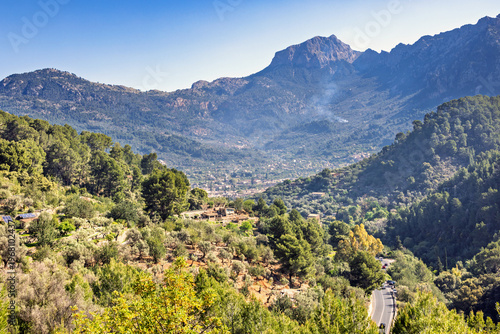 Landscape view at a road in an mountain valley with lush green trees in Mallorca