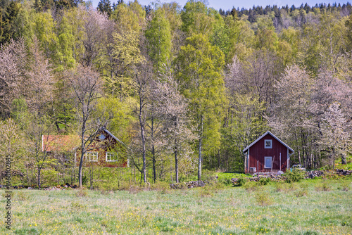 Budding fruit trees by a red house at the forest edge a sunny spring day