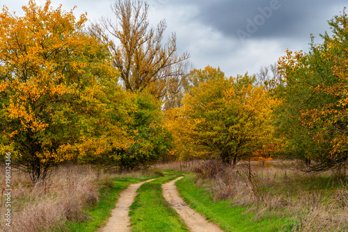 beautiful landscape of country road in autumn forest with bright yellow leaves on trees, cloudy weather