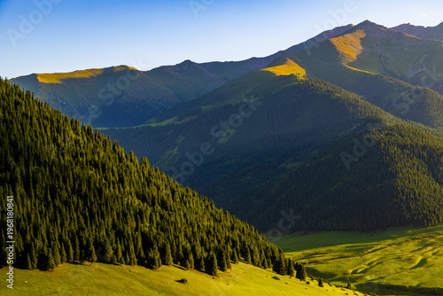 Awe-inspiring mountain landscape features lush forest and rolling hills under a clear sky. Peaceful scene captures the beauty of nature in Kyrgyzstan.