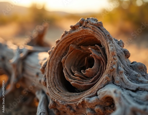 Close up textured wood grain with swirling patterns. Dry dead tree trunk fragment rests on blurred desert sand background. Rustic natural organic material.