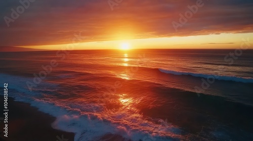 A fiery sunset over the ocean with crashing waves and a dramatic sky.