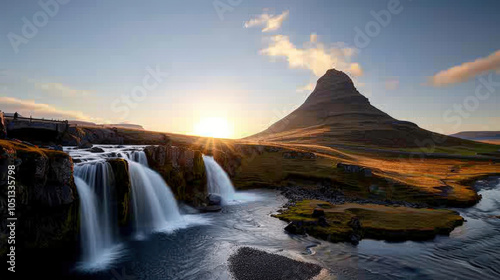 Breathtaking Kirkjufell Mountain stands majestically under clear sky, with cascading waterfalls flowing into serene river. golden light of sunrise enhances tranquil beauty of this iconic landscape