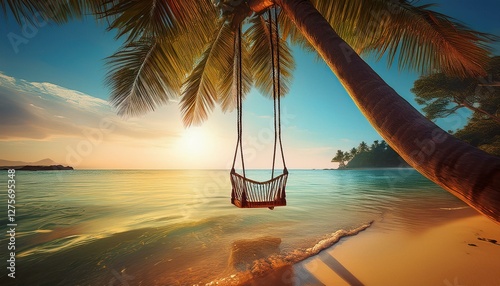 A swing hanging from a palm tree, floating just above the water on a secluded beach, creating a tranquil and idyllic tropical escape.