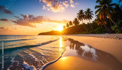 Tropical sunset beach scene. Golden light on a pristine shore