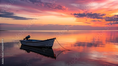 Serene Boat at Dusk: Peaceful Water Reflections Under a Vibrant, Colorful Sky Landscape Panorama.