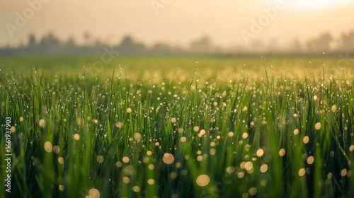 Expansive field of lush green grass bathed in warm golden sunlight, delicate water droplets glimmering on blades,