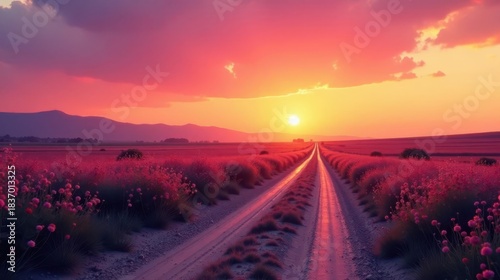 Serene Sunset Vista A sun-kissed country road winds through vibrant purple wildflowers, leading towards a breathtaking sunset over a tranquil landscape.
