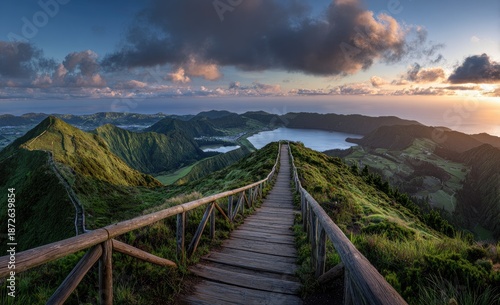 Wooden path leading through lush green hills, overlooking lakes and coastline at sunset