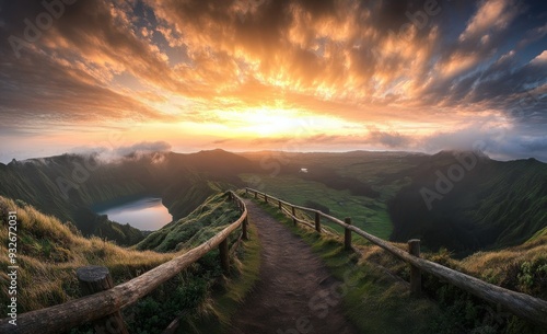 Scenic Path Leading to Schoppe, Azores, with a Stunning Sunset Sky Overlooking a Green Valley and Blue Lakes, Featuring a Rugged Wooden Guardrail and Dramatic Clouds