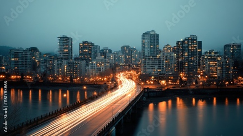 Serene Urban Landscape at Dusk Overlooking a Cityscape with Illuminated Buildings and Light Trails from Moving Vehicles Along a Bridge and Waterway