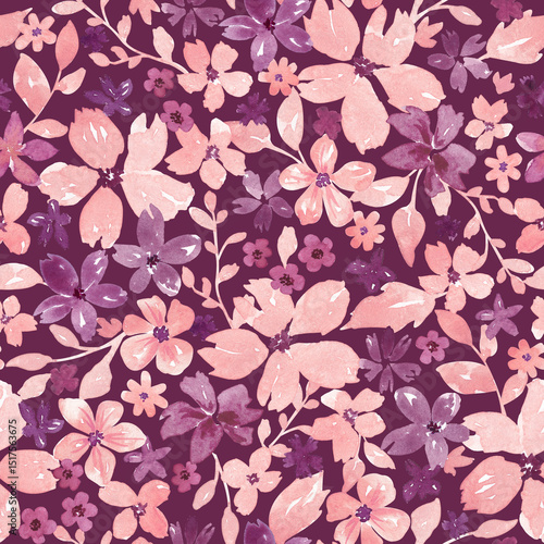 Floral fashion print. Retro flowers repeat pattern. Abstract drawing. Warm colors. Digital paper hand drawn with watercolor. Floral seamless tile for seasonal textile, fabric, clothing