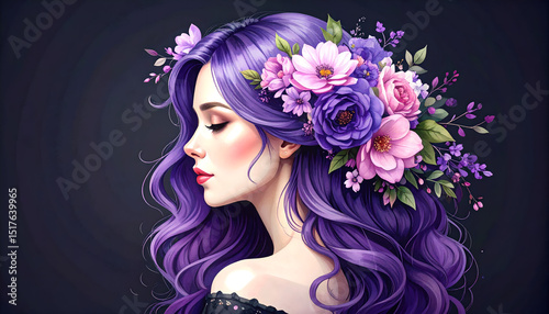 Beautiful Woman with Purple Hair and Flower Crown, Watercolor Illustration