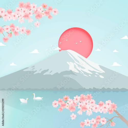 paper art of japan landmark travel banner with fuji mountain and cherry blossom flower background vector